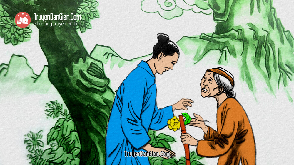 Chàng trai chạy ào tới bên bông hoa. Trước vẻ linh thiêng của nó, chàng sợ không dám hái. Chàng nhắm mắt lại, đôi tay đưa ra hướng về phía bông hoa kỳ diệu, miệng thì thầm những lời cầu khấn chân thành. Chàng bỗng thấy đôi bàn tay trĩu nặng và toàn thân rùng rùng lay động. Một cảm giác lâng lâng lạ lùng lan tỏa khắp thân mình chàng. Mở mắt ra, chàng vô cùng kinh ngạc vì thấy bông hoa đã nằm gọn trong bàn tay.